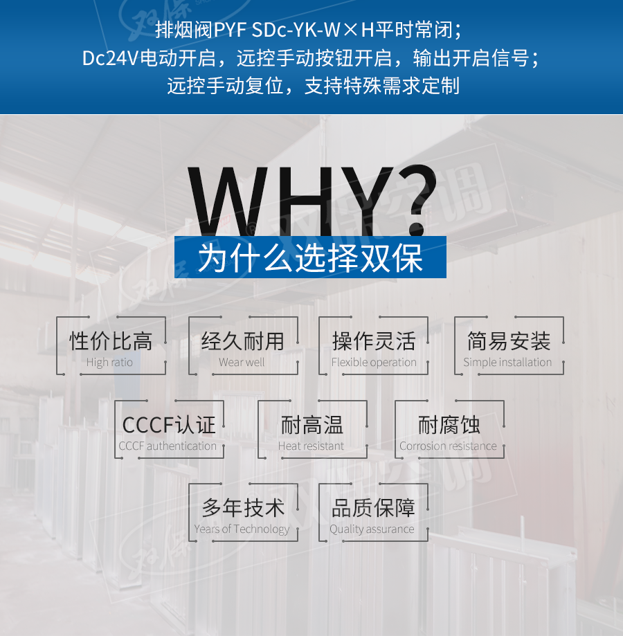 江蘇雙保空調有限公司—遠控排煙閥 閥門平時常閉; Dc24V電動開啟,遠控手動開啟,輸出開啟信號; 遠控手動復位。
