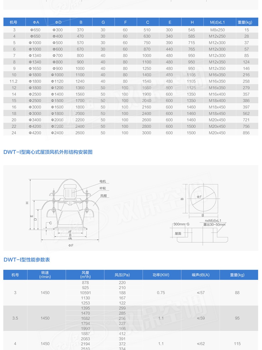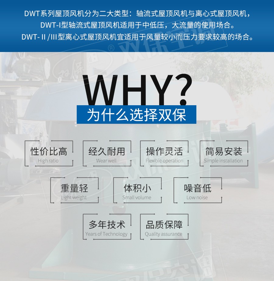 【風機特點】DWT系列屋頂風機分為二大類型。其一,軸流式屋頂風機:型號為DWT-I型適用于中低壓,大流量的使用場合。其二,離心式屋頂風機:型號為DWT-Ⅱ型、DWT-Ⅲ型二種型式,宜適用于風量較小而壓力要求較高的場合。
