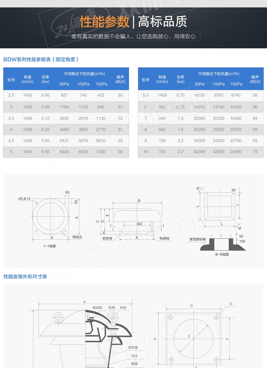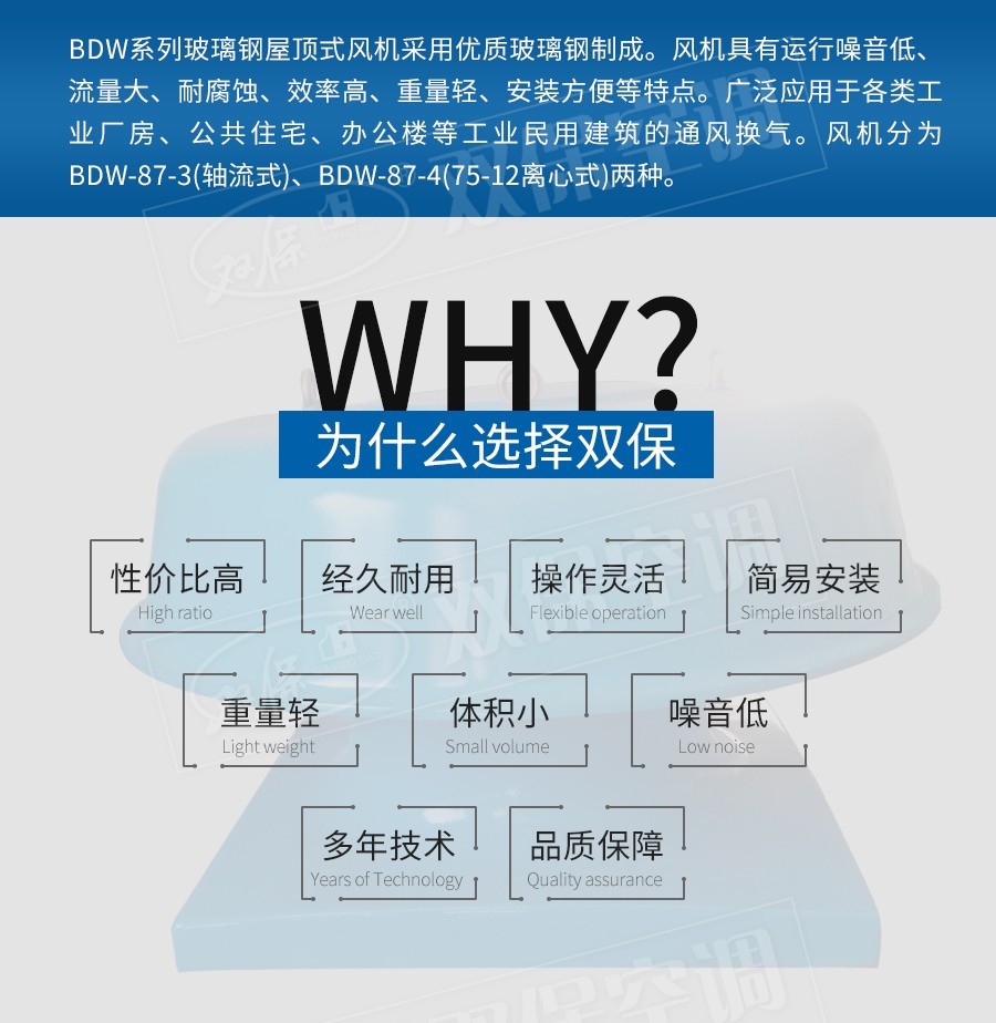 江蘇雙保空調有限公司—BDW系列玻璃鋼屋頂式風機采用優質玻璃鋼制成。風機具有運行噪音低、流量大、耐腐蝕、效率高、重量輕、安裝方便等特點。廣泛應用于各類工業廠房、公共住宅、辦公樓等工業民用建筑的通風換氣。風機分為BDW-87-3(軸流式)、BDW-87-4(75-12離心式)兩種。