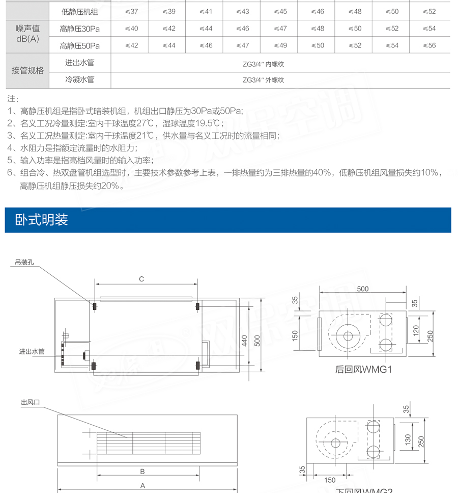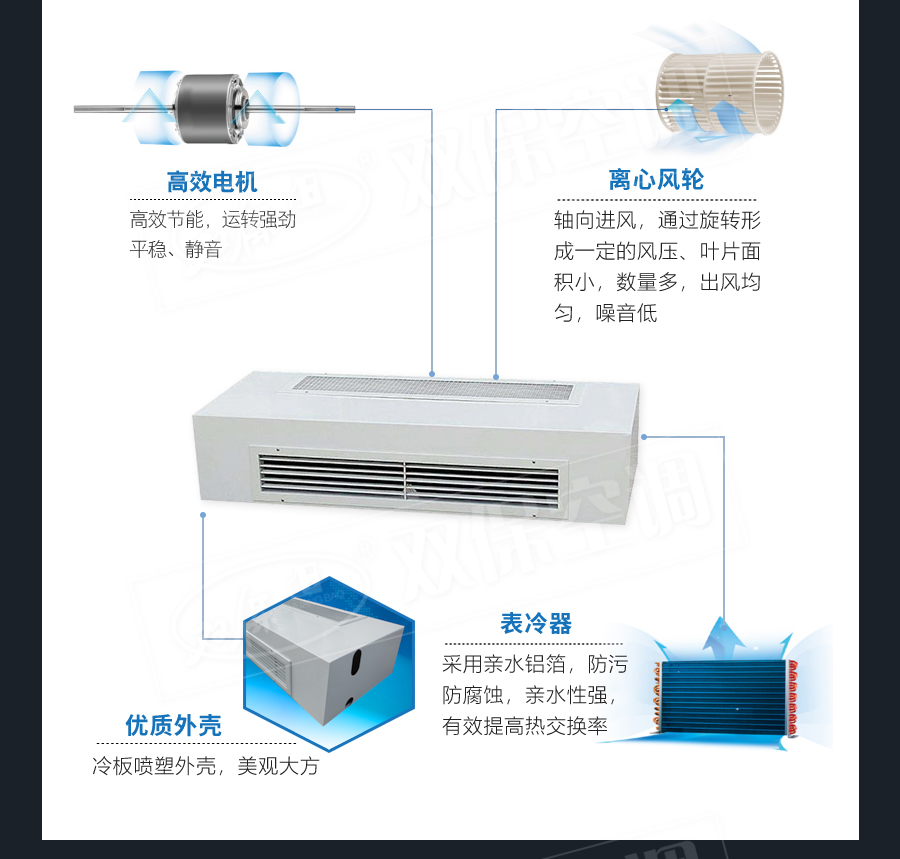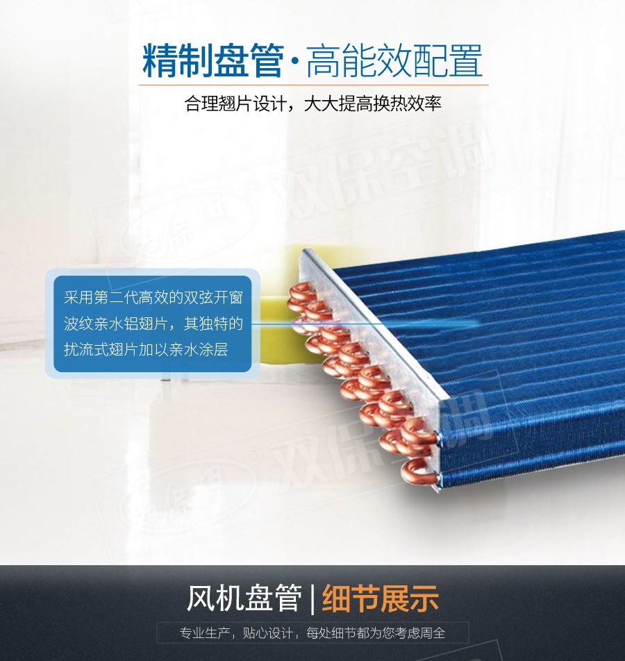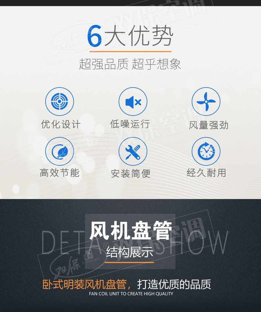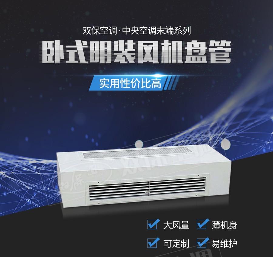 江蘇雙保空調有限公司—臥式明裝風機盤管是中央空調理想的末端產品,其工作原理是機組內不斷的再循環所在房間或室外的空氣,使空氣通過冷水(熱水)盤管后被冷卻(加熱),以保持房間溫度的恒定。外形美觀,與新風機組配套后廣泛應用于賓館、醫院、辦公用房、高級會議廳、展覽廳等低噪聲場所。